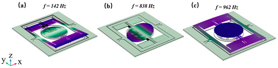 Modal results of the design: (a) slow-axis torsion mode; (b) fast-axis torsion mode; (c) piston mode.