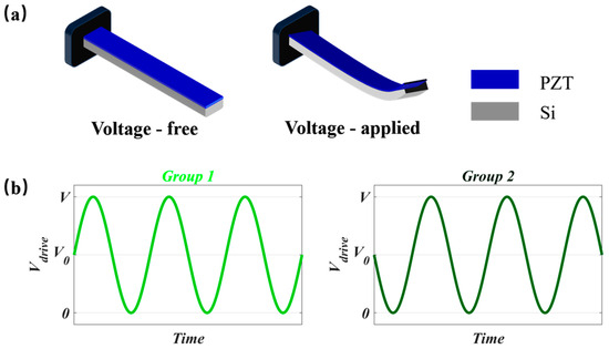 Piezoelectric drive: (a) principle of piezoelectric cantilever drive; (b) voltage signals with a 180° phase difference for two sets of drives.