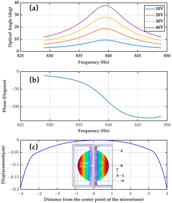 Figure 6 shows the frequency response characteristics under electrical excitation, including the optical angle as a function of the drive frequency and the corresponding phase shift. As shown in Figure 6a, the angle exhibits resonant behavior, with a peak amplitude of approximately 39° occurring at a resonant frequency of around 838 Hz. The figure below shows the corresponding phase shift between the input drive signal and the optical angle. As the drive frequency increases from 830 Hz to 845 Hz, the phase response changes from approximately −15° to −145°. It is worth noting that a rapid phase drop occurs near the resonance frequency, where the phase shift is approximately −90°, consistent with the typical −90° phase shift observed in second-order resonant systems.