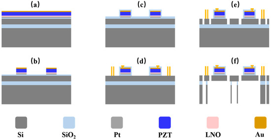 Manufacturing process flow: (a) preparation of the bottom electrode, seed layer LNO, piezoelectric layer PZT, and top electrode; (b) patterning of PZT and electrodes; (c) deposition of PECVD SiO2 on the top Au layer; (d) electroplating of coils; (e) DRIE etching of the device layer; (f) patterning and release of the handle layer and BOX.