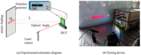 An optical measurement system was used to quantitatively evaluate the scanning distortion caused by slow-axis coupling during fast-axis excitation, as shown in Figure 9. The experimental platform consisted of a signal generator, a voltage amplifier, the MEMS mirror, a laser source (650 nm, 5 mW), and a projection screen for image acquisition. A voltage matching the fast-axis resonant frequency was generated, then applied to the driving pad of the mirror, inducing resonant motion along the fast axis.