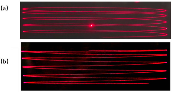 Figure 12 illustrates the schematic diagram of raster scanning achieved through a dual-axis drive. In Figure 12a, when using a single coil, the scanning trajectory exhibits a distinct overlapping reciprocating pattern. This indicates significant mechanical crosstalk between the axes. In contrast, Figure 12b shows the raster trajectory produced by the hybrid-driven mirror under the same driving conditions. It forms a clean rectangular grid with uniform line spacing, making this design suitable for optical scanning applications such as LiDAR.