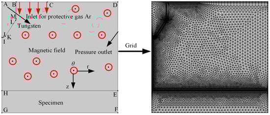 The maximum unit at the boundary is 0.0838 mm, with a boundary layer count of 6. The mesh type employed is triangular, and the protective gas for the tungsten electrode is high-purity argon. The model is developed in the COMSOL Multi-physics software platform and executed on a PC with Intel Core i7-9700, 3.00 GHz, 56 GB RAM and Windows 10 system. Numerical model of “Impact of magnetic fields on arc pressure, temperature, plasma velocity, and voltage” in TIG welding required 1 h to complete the calculations. The capital letters in Figure 1 indicate boundary points. To simplify models, the following assumptions have been made as follows: