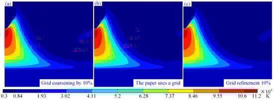 Figure 2 shows the temperature distribution cloud maps of the arc under three different grid settings, where the minimum cell size in Figure 2b is 0.00025 mm and the maximum cell size is 0.0838 mm. The maximum and minimum cell sizes in Figure 2a are 10% larger than those in Figure 2b, while those in Figure 2c are 10% smaller than those in Figure 2b. From Figure 2a–c, it can be observed that although there are slight differences in the temperature field of the arc under the three different grid configurations, the differences are minimal. This indicates the independence of the selected minimum cell size of 0.00025 mm and maximum cell size of 0.0838 mm in this study.