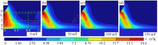 Arc morphology and temperature under different magnetic fields: (a) magnetic field of 0 mT, (b) magnetic field of 50 mT, (c) magnetic field of 100 mT, and (d) magnetic field of 150 mT.