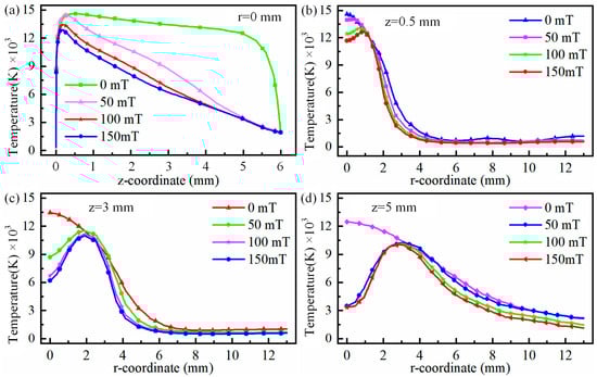 Temperature below tungsten electrode at 0.5 mm, 3 mm, 5 mm and on arc centre axis for different magnetic fields: (a) r = 0 mm, (b) z = 0.5 mm, (c) z = 3 mm, and (d) z = 5 mm.