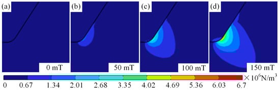 It should be noted that as the magnetic field changes, the form of temperature variation from centre to edge of the arc changes. The pattern transitions from a gradual centre-to-edge decrease to an initial increase followed by a decrease, as shown in Figure 4b–d. This change in the shape of the temperature field is mainly attributable to the deviation of plasma towards arc edges under magnetic field influence. Furthermore, it can be observed from Figure 4b–d that the variation in the arc temperature field induced by the magnetic field becomes increasingly pronounced with the increasing distance from the cathode. This is primarily due to the fact that as plasma moves further from the cathode, it deviates further from the arc axis under the influence of the Lorentz force. Figure 6 shows the force cloud of the plasma under different magnetic fields. With increasing magnetic field, the magnitude of the Lorentz force acting on plasma near the cathode gradually increases, and the area subject to the greater Lorentz force also gradually increases, as shown in Figure 6a–d. This results in plasma deviating further from the edge as the magnetic field strength increases, even though the distance travelled along the axis remains constant. This conclusion can also be verified by measuring the distance between the hot zone at the anode and the centre axis of the arc, as shown in Figure 3b–d. This is also one of the reasons why the temperature near the anode along the arc axis decreases as the auxiliary magnetic field strength increases.
