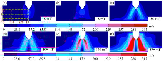 Motion velocity diagram of arc plasma at different magnetic fields: (a) magnetic field of 0 mT, (b) magnetic field of 8 mT, (c) magnetic field of 50 mT, (d) magnetic field of 100 mT, (e) magnetic field of 150 mT, and (f) magnetic field of 579 mT.