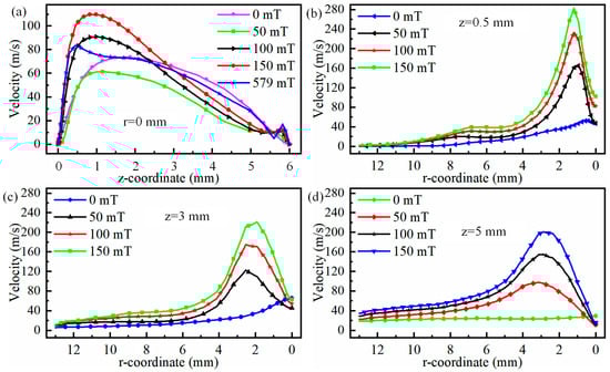 The radial velocity of the plasma at positions 0.5 mm, 3 mm, and 5 mm below the cathode is illustrated in Figure 8. It can be observed from Figure 8a that regardless of the magnitude of the magnetic field, the plasma velocity along the central axis increases and then decreases from the cathode to the anode. Meanwhile, as the magnetic field strength increases, the maximum velocity along the central axis shifts closer to the cathode. Specifically, when the magnet field is 0 mT, the maximum velocity occurs at 1.6 mm below the cathode. When the magnetic field increases to 150 mT, the maximum velocity occurs at 0.8 mm below the cathode. Even when the magnetic field increases to 579 mT, the maximum velocity occurs at 0.5 mm below the cathode, as shown in Figure 8a. Meanwhile, regardless of the magnetic field, the plasma velocity at z = 6 mm is almost equal. The variation in plasma velocity along the cathode centre axis can be explained by the Lorentz force. When the plasma is near the cathode, the electric field force accelerates the plasma, but once it reaches a certain position, the electric field force begins to oppose the plasma velocity. In particular, near the anode, due to the accumulation of plasma, the opposing effect on the plasma moving toward the anode is strongest. Ultimately, when the plasma reaches the anode substrate at z = 6 mm, its velocity is reduced to zero under the combined effects of the electric field force and the substrate, as shown in Figure 8a. Additionally, the plasma along the central axis is deflected away from the central axis due to the magnetic field force. Therefore, the velocity at the central axis after applying the magnetic field is not the maximum velocity in the arc, as shown in Figure 8b–d.