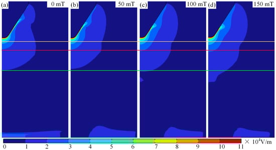 Electric field gradients of arcs in different magnetic fields: (a) magnetic field of 0 mT, (b) magnetic field of 50 mT, (c) magnetic field of 100 mT, and (d) magnetic field of 150 mT.