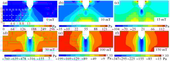 The distribution of arc pressure in tungsten inert gas welding under different magnetic fields is illustrated in Figure 10. Figure 10a–f illustrates that when no auxiliary magnetic field is applied during arc welding, there is no negative pressure within the arc, and the arc pressure is relatively high at both the positive and negative electrodes, with positive values. However, when the auxiliary magnetic field is applied to TIG welding, negative pressure begins to appear inside the arc, and even after magnetic field is greater than 0.1 T positive pressure does not exist inside the arc. The arc negative pressure decreases from 296 Pa at a magnetic field of 0 T to −3470 Pa at 0.15 T, representing 12.72 times difference, as shown in Figure 10b–f. When TIG welding is performed without an external magnetic field, the absolute value of the cathode pressure is greater than that of the anode. When a magnetic field is applied, the absolute value of anode pressure becomes higher than that of cathode. Therefore, the auxiliary magnetic field provides a new method for regulating the pressure of the TIG welding pool. Notably, as the magnetic field is introduced, negative pressure first appears at the midpoint between the anode and cathode. With a magnetic field of 0.015 T, the pressure along the central axis of the anode and cathode is divided into two parts, and the pressure values of these two parts decrease as the magnetic field strength increases, as illustrated in Figure 10b–d. Additionally, as the magnetic field strength increases, the negative pressure first expands toward the cathode and then spreads across the entire central axis, as illustrated in Figure 10b–f. The appearance of arc negative pressure is primarily influenced by arc magnetostriction and thermal pressure.