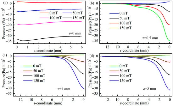Pressure between the central axis and radial direction below the cathode: (a) r = 0 mm, (b) z = 0.5 mm, (c) z = 3 mm, and (d) z = 5 mm.