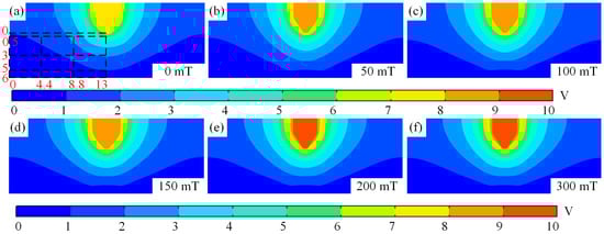 Figure 12 shows the electric field contour map of the tungsten electrode TIG welding arc in different magnetic fields. From Figure 12a–f, as the magnetic field increases, as the magnetic field strength increases, the arc voltage increases only from 7.7 V at 0 T to 9.3 V at 0.3 T, indicating a minimal increase. Even when the magnetic field reaches 0.3 T, the voltage only increases by 1.6 V. Therefore, it can be concluded that the magnetic field has a negligible effect on the voltage. This is primarily due to the fact that after applying a magnetic field in TIG welding, the plasma shifts away from the central axis toward the periphery. This results in minimal disturbance to the electric field distribution, leading to insignificant voltage variations. Additionally, the arc voltage decreases gradually from the central axis towards the periphery, and the potential gradient beneath the cathode is larger than in other regions.
