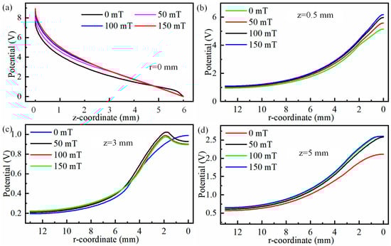 Figure 13 shows the line graphs of the radial potential at the centre axis of the TIG weld and at positions 0.5 mm, 3 mm, and 5 mm below the cathode. From Figure 13a, it can be seen that the potential strength along the centre axis from the cathode to the anode initially decreases rapidly followed by a slower decrease, regardless of the auxiliary magnetic field. During the interval of rapid decrease in potential, the decreasing trend reduces slightly as the magnetic field strength increases, but during the slow decrease phase, the rate of decrease increases slightly as the magnetic field strength increases, as shown in Figure 13a. When radial potentials at 0.5 mm, 3 mm, and 5 mm positions below the cathode are observed, it is found that while the maximum potential at the 3 mm position below the cathode does not increase with increasing magnetic field strength, the potentials at 0.5 mm and 5 mm positions below the cathode increase with increasing magnetic field strength, as shown in Figure 13c,d. The maximum electric potential located 3 mm beneath the cathode does not increase with the rise in magnetic field strength. This phenomenon primarily occurs due to the deviation of the plasma from the central axis. Such deviation results in a reduction in the electric potential in the vicinity of the central axis region, as illustrated in Figure 12d–f.