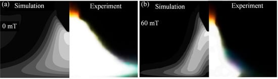 Experimental verification of arc shape: (a) comparison between simulation and experiment under the magnetic field of 0 mT, and (b) comparison between simulation and experiment under the magnetic field of 60 mT.