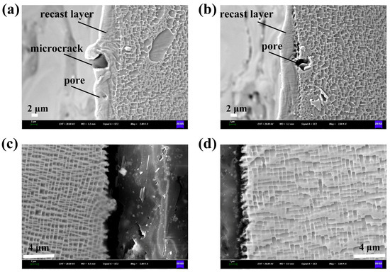 - Femtosecond laser processing does not introduce a recast layer on the film-cooling holes, while EDM results in a recast layer of approximately 2 μm. Different from the matrix, the recast layer has a single-phase γ structure and is deficient in Al element. Moreover, the microcracks, pores, and other defects inside the recast layer are a potential reason for reducing the mechanical properties of the gas film pores. The abrasive flow can almost completely remove the recast layer and cause local plastic deformation on the hole wall.