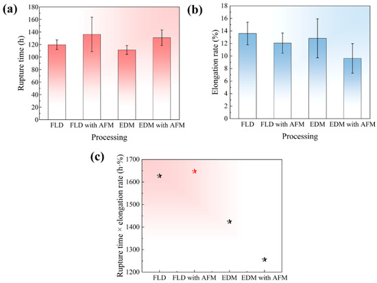 - The high-temperature creep performance of femtosecond laser processing of film-cooling holes is superior to that of EDM, which is caused by the recast layer. The abrasive flow prolongs the rupture time of film-cooling holes but reduces the elongation rate. Specifically, after abrasive flow, the rupture time of the film-cooling holes obtained by femtosecond laser increased from 119.64 h to 136.15 h, an increase of 13.8%. The elongation rate decreased from 13.6% to 12.1%. Based on the comprehensive rupture time and elongation, femtosecond laser combined with abrasive flow machining has the best performance, with a product of 1647.4 h %.