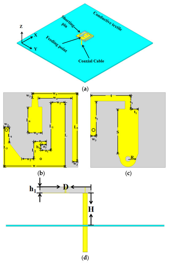 The proposed antenna design is illustrated in Figure 1 with detailed dimensional parameters as Table 1. It consists of a button head, a coaxial cable, and a metallized textile ground plane. The textile plane (side length of 100 mm, thickness of 0.1 mm) exhibits a high conductivity of 1.18 × 105 S/m, ensuring effective performance in wearable applications. To obtain good and stable radiation performance, the button head employs an F4BM220 substrate (depicted in gray in Figure 1b) with patterned copper layers (shown in yellow in Figure 1b,c). The top layer incorporates a radiating element and parasitic structure, while the bottom layer features a ground plane, forming a compact, high-performance antenna configuration. Given the stringent size constraints of coaxial cables in button antenna design, the LA150 coaxial cable (Lair Microwave in the Suzhou, China) is selected to preserve the antenna’s impedance bandwidth and prevent high-frequency signal distortion. The LA150 coaxial cable serves as the center post whose inner conductor is connected to the top radiating element and outer conductor linked to the ground plane through an annular structure. The feed height H is designed to be approximately a quarter-wavelength at 5.8 GHz in free space. This height not only enables directional radiation at 5.8 GHz but also plays a critical role in tuning the low-frequency resonant characteristics.