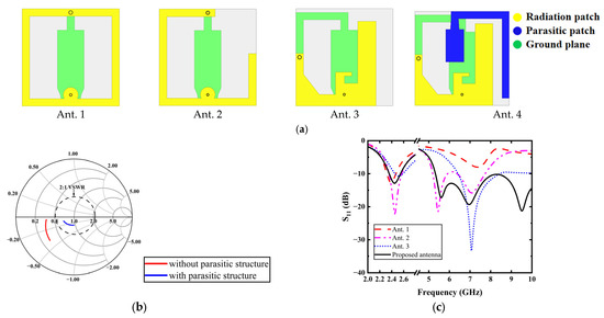 (a) Antenna evolution process; (b) Smith chart comparison of 5.8 GHz impedance with and without parasitic structure; (c) S11 with the antenna evolution.