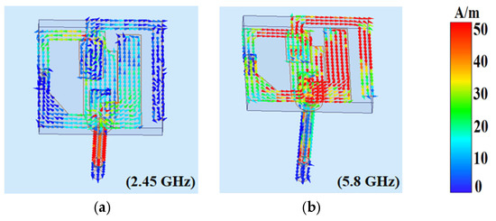 Surface current of button antenna at (a) 2.45 GHz; (b) 5.8 GHz.