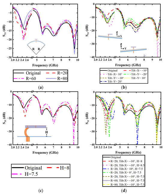 (a) The bending of conductive textiles with different radiuses of R; (b) Tilting the coaxial cable in different directions; (c) The bending of coaxial cable with different H; (d) Simultaneous bending of tilted conductive textiles and coaxial cable.
