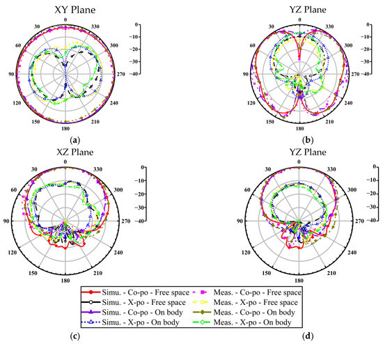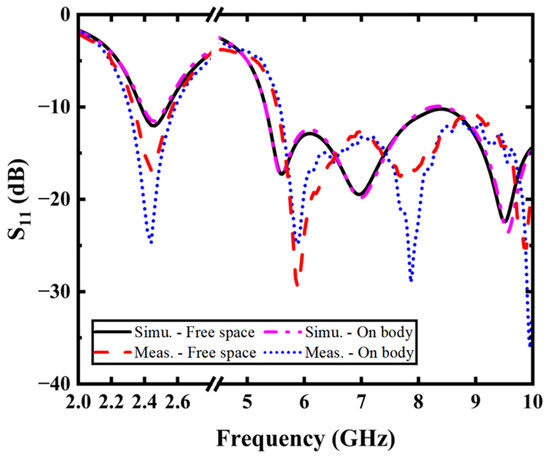 The reflection coefficient results are shown in Figure 6. A good agreement to the simulation result is achieved for both free-space and on-body evaluations. For the measured reflection coefficient lower than −10 dB, the proposed antenna still covers the desired frequencies in two scenarios. The measured on-body impedance bandwidths are 300 MHz (2.3–2.6 GHz) in the low band and 4.5 GHz (5.5–10 GHz) in the high band. This thorough experimental validation confirms the design’s robust performance across both target frequency bands while accounting for practical deployment conditions in wearable applications.