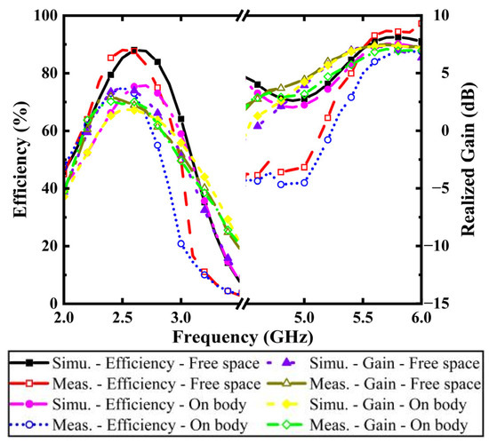 Figure 7 presents the simulated and measured radiation efficiency and realized gain of the proposed antenna in free space and on-body scenario. The results demonstrate that while the radiation efficiency and realized gain are decreased in the presence of a human body model, the design maintains remarkable efficiency levels of about 76% in the low band (2.4–2.4835 GHz) and 93% in the upper band (5.725–5.875 GHz). And the measured peak gains reaching 2.5 dB at 2.45 GHz and 6.9 dB in the 5.8 GHz.