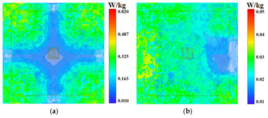 SAR distribution on a three-dimensional human body model. (a) 2.45 GHz; (b) 5.8 GHz.