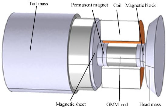 Ultrasonic waves are widely applied in areas such as agriculture, industry, environmental preservation, and medical science. High-frequency electrical signals are converted into the required ultrasonic vibrations by the transducer, which are the primary components within the ultrasonic vibration system. At present, piezoelectric transducers and magnetostrictive transducers are the most widely employed in industrial applications [1]. When compared with piezoelectric ceramics, Giant Magnetostrictive Materials (GMMs) exhibit a high energy density, large magnetostrictive coefficient, high thermal conductivity, good heat dissipation, strong load capacity, no overheating failure, fast response speed, and lower sound velocity; its size is one-third smaller than that of a piezoelectric transducer of the same frequency [2]. These characteristics determine that GMMs are exceptional functional materials for developing high-power, large-amplitude, and wideband ultrasonic processing systems. GMMs’ outstanding dynamic performance render them suitable for applications in areas like sensors, transducers, loudspeakers, and vibration energy harvesting [3,4,5,6].