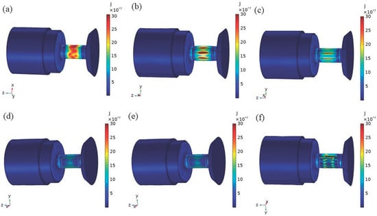 Figure 10 shows the eddy current loss of coils in transducers with several structural rods. The coil in the transducer with an untreated rod (Figure 10a) exhibited the highest eddy current loss; in comparison to the transducer with the untreated rod, the eddy current loss of the coil in the transducer of the sliced rods (Figure 10d–f) and the transducer of the slit rods (Figure 10b,c) was reduced; and the eddy current loss of the coil in the transducer with the slice treatment rod (Figure 10e) was the smallest.