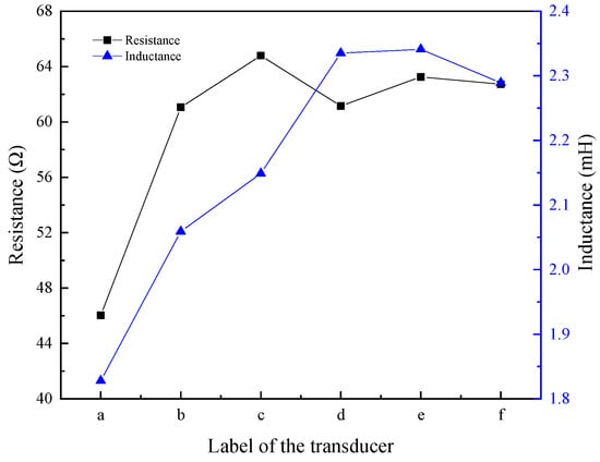 Figure 11 shows the inductance and resistance of transducers with different structural rods. For the transducer with an untreated rod, its coil resistance and inductance were the lowest; in comparison with the transducer featuring an untreated rod, both the resistance and inductance of the coil in transducers with sliced rods (Figure 11d–f) and those with slit rods (Figure 11b,c) were increased. The inductance of transducers with sliced rods (Figure 11d–f) was higher than that of those with slit rods (Figure 11b,c). Resistance and inductance indicate the transducer’s ability to dissipate and store magnetic energy. The higher the resistance, the greater the magnetic energy of the transducer; a larger inductance corresponds to a greater amount of magnetic energy stored in the transducer.