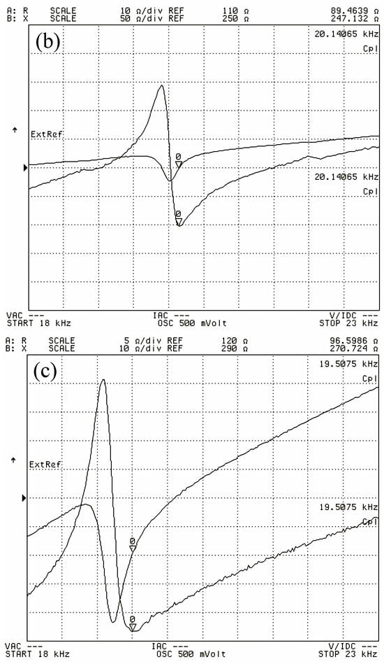 Impedance curve of transducer: (a) untreated, (b) radial slit, and (c) sliced rod at both ends.