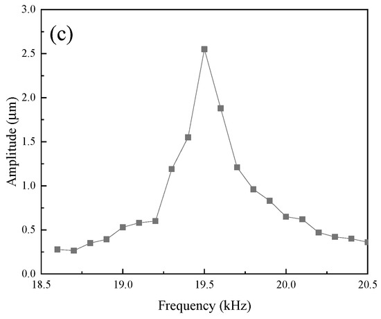 A high-speed bipolar power supply (BP4620, NF, Yokohama, Japan) was employed to generate the ultrasonic frequency electrical signal required by the transducer, and a laser vibrometer (LV-S01, Sunny Optical, Ningbo, China) was utilized to measure the transducer’ amplitude. Figure 15 shows the experimental setup for testing the transducer. Figure 16 shows the output amplitudes of three transducers at varying powers. Figure 17 shows the amplitudes at various frequencies of the transducer. The results indicate that the output amplitude of the transducer was largest near the resonant frequency; the amplitudes of all three transducers increased with the increase in power; the transducer with an untreated rod exhibited the smallest output amplitude; and the transducer with a sliced rod at both ends had a larger amplitude than that with a radial slit rod.