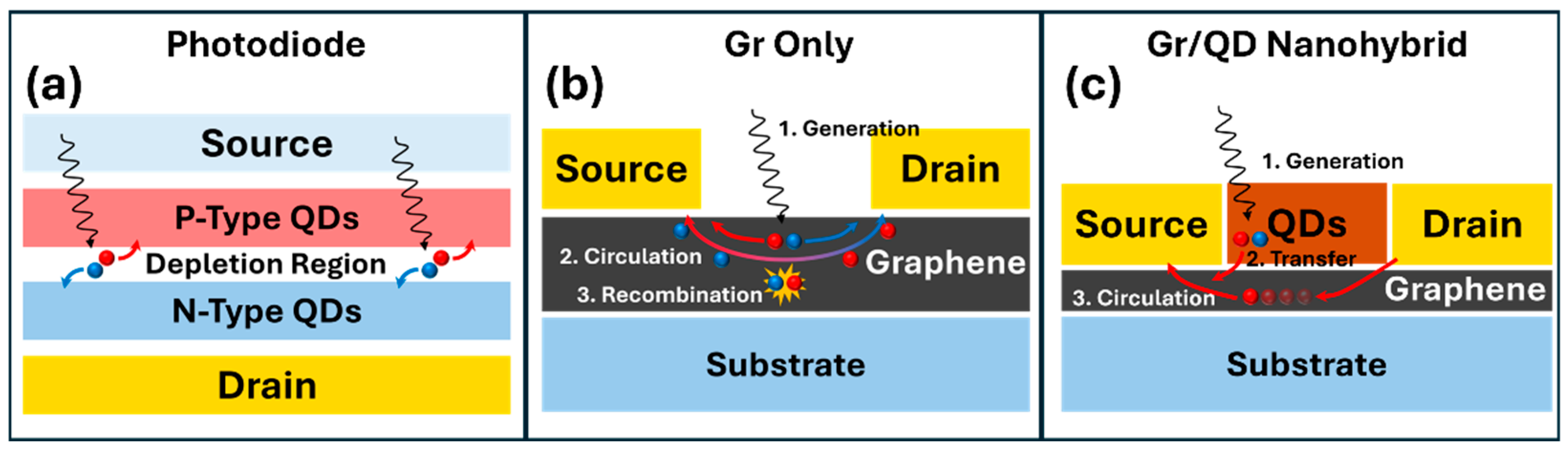 - Shultz, A.; Liu, B.; Gong, M.; Vargas, H.B.; Robles Hernandez, F.C.; Wu, J.Z. Probing the Critical Role of Interfaces for Superior Performance in PbS Quantum Dot/Graphene Nanohybrid Broadband Photodetectors. ACS Appl. Mater. Interfaces 2024, 16, 21302–21310. [Google Scholar] [CrossRef] [PubMed]