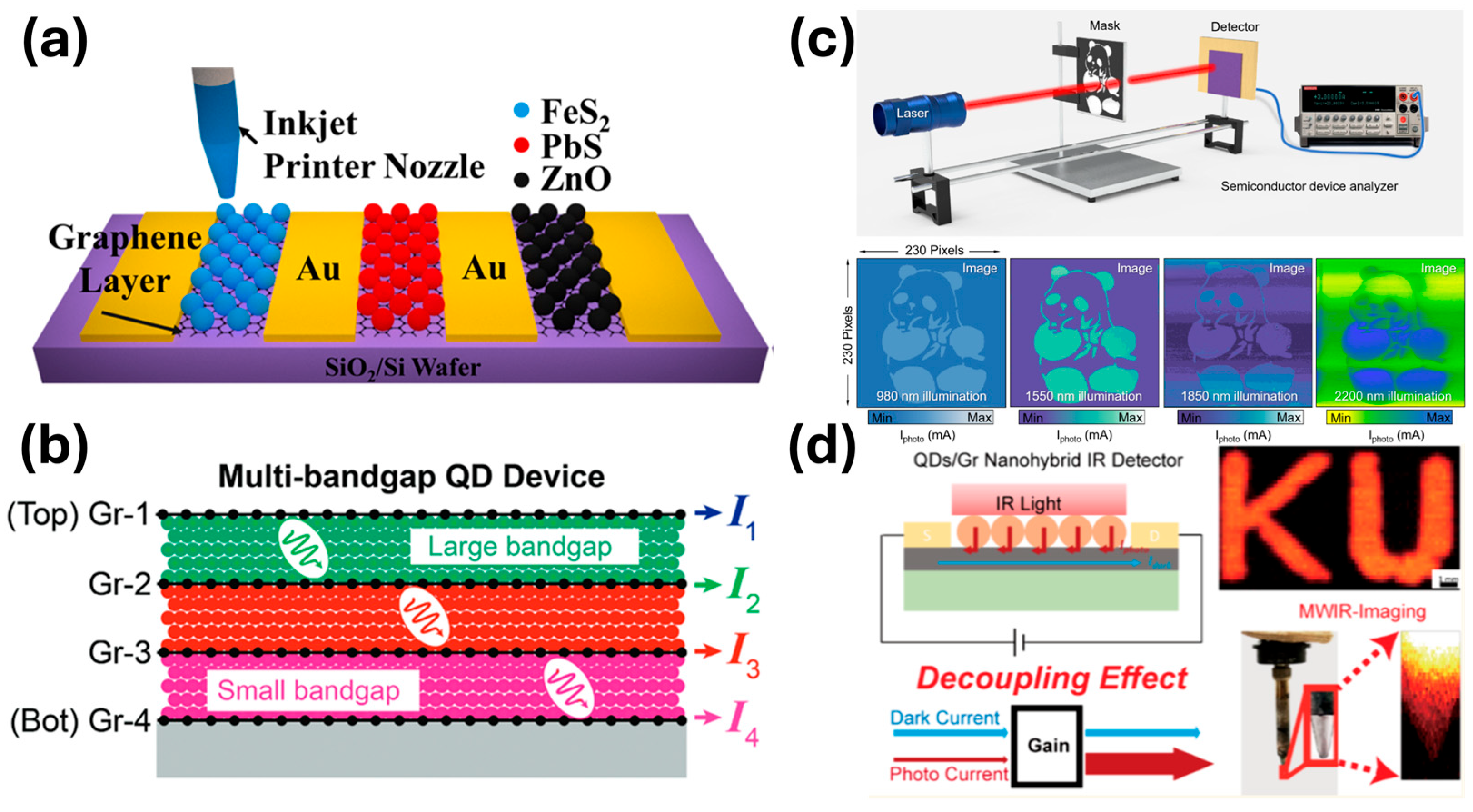 - Ahn, S.; Shang, J.Y.; Patel, S.K.; Alvarado, E.; Ndao, A.; Vazquez-Mena, O. Intercalated graphene and colloidal quantum dots for multispectral photodetection. Adv. Funct. Mater. 2024, 34, 2409523. [Google Scholar] [CrossRef]