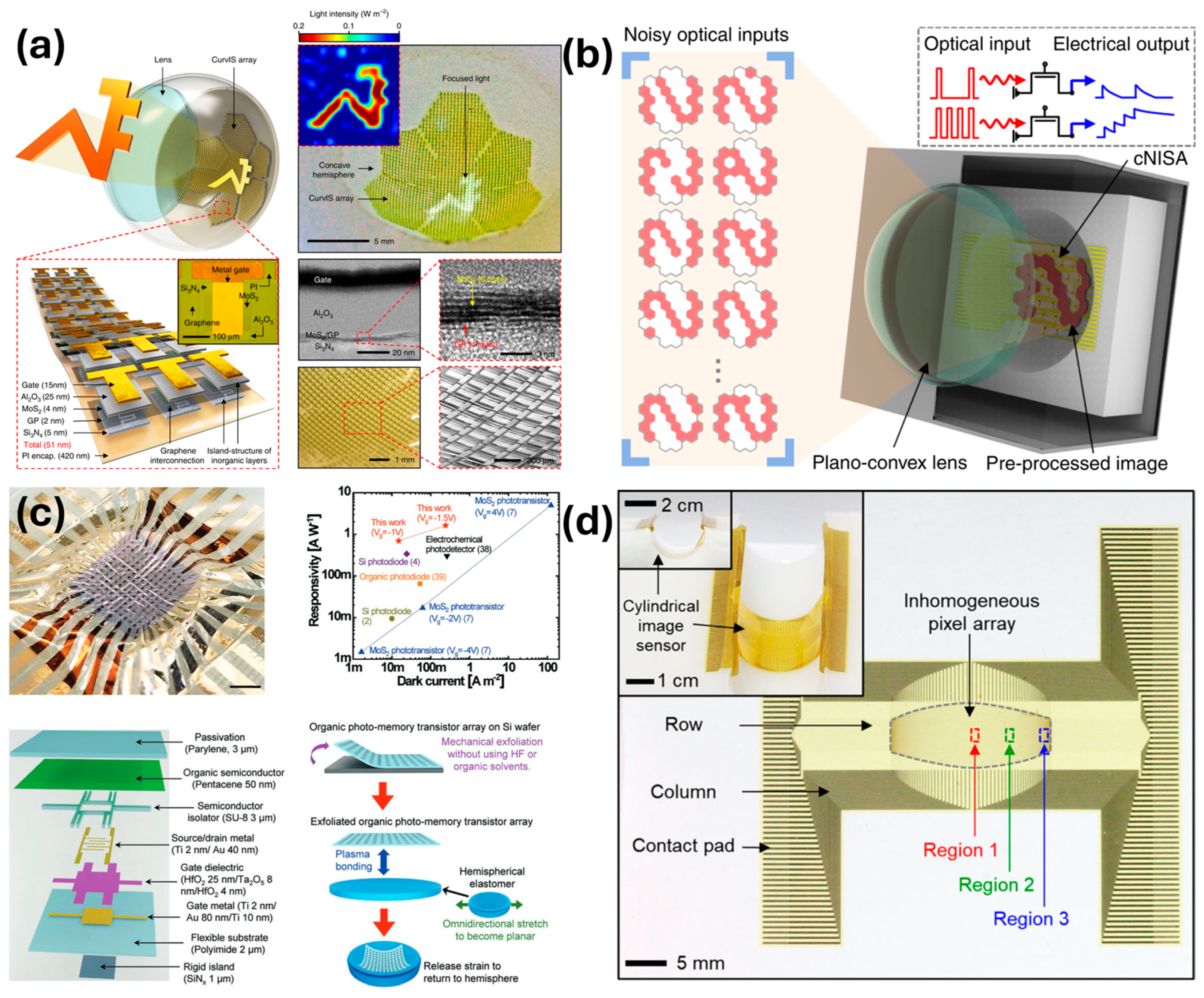 - Kim, Y.; Zhu, C.; Lee, W.Y.; Smith, A.; Ma, H.; Li, X.; Son, D.; Matsuhisa, N.; Kim, J.; Bae, W.G. A hemispherical image sensor array fabricated with organic photomemory transistors. Adv. Mater. 2023, 35, 2203541. [Google Scholar] [CrossRef]