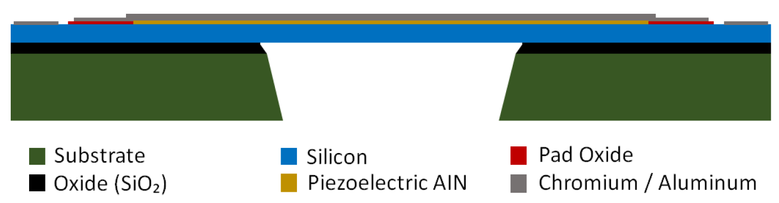 Figure 1, starting from a double-side-polished SOI wafer (10 µm device silicon/1.0 µm buried oxide/400 µm handle). The device silicon is surface-doped to form the bottom electrode. A thermal oxide isolation layer (PADOXIDE, 0.20 µm) is then grown and patterned to provide electrical isolation while opening contact regions where required. Next, the piezoelectric AlN film (PZFILM, 0.5 µm) is deposited and patterned. The Cr/Al top electrode and routing layer (PADMETAL, 20 nm Cr beneath 1.0 µm Al) is subsequently deposited and patterned. The device silicon is then etched by DRIE down to the buried oxide to define the structures. For release, a temporary front-side polyimide protection layer is applied, and the substrate is etched from the backside (TRENCH) by DRIE through the handle wafer, followed by a wet oxide etch to remove the buried oxide in the trench-defined regions and release the suspended structures.