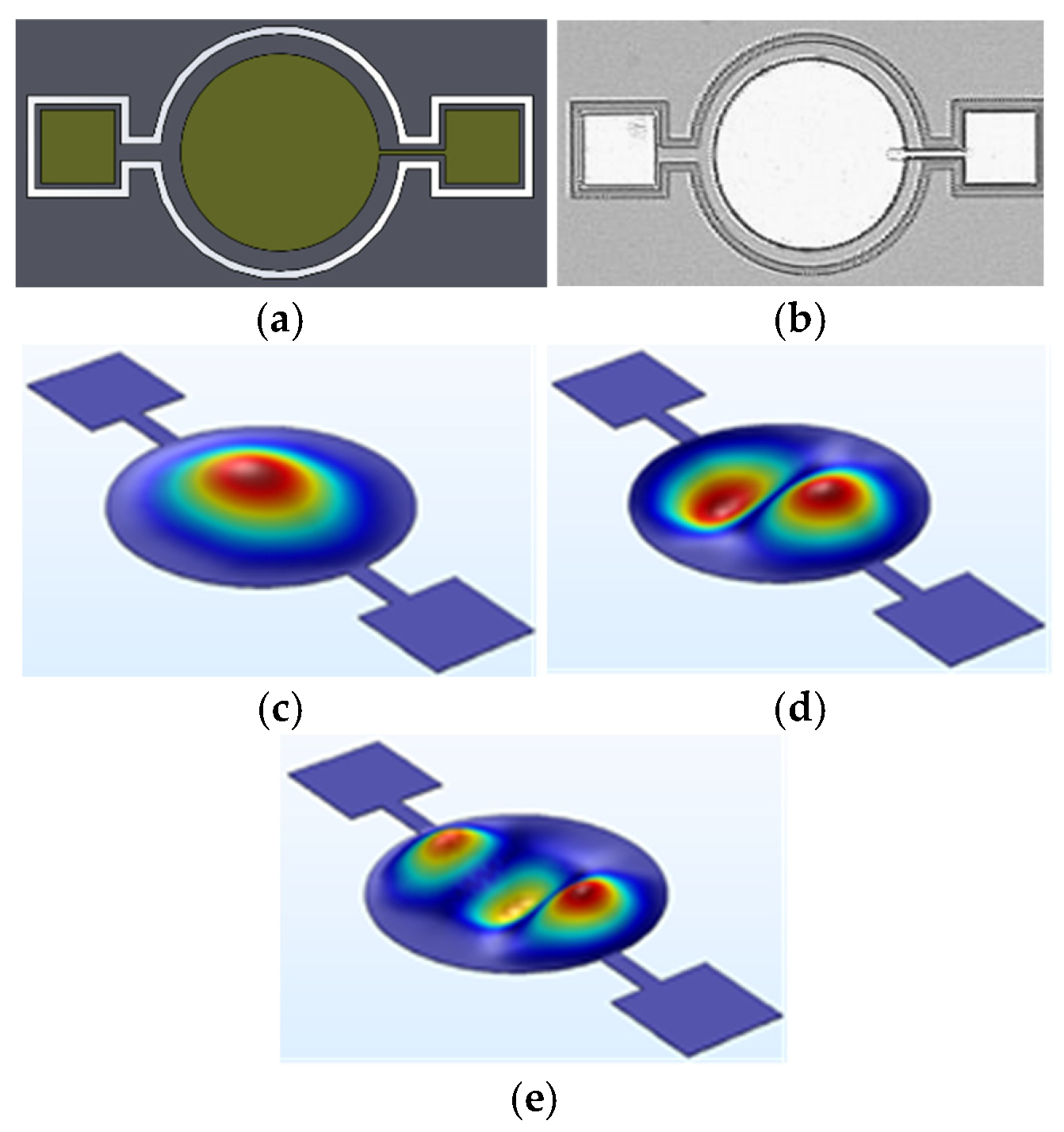 Circular diaphragm micro-structure at (a) Device CAD design, (b) Microscope image of the fabricated device, (c) Mode 1, (d) Mode 2 and (e) Mode 3.