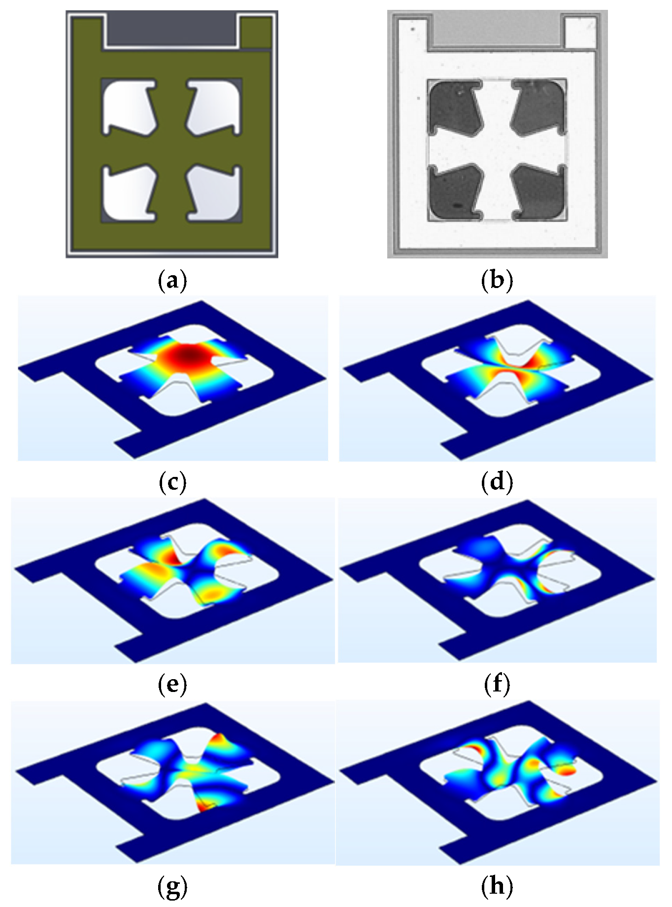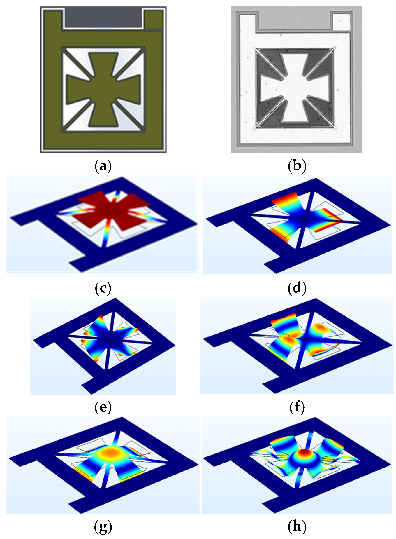 Figure 8. This geometry retains a central suspended membrane but employs four symmetrical anchor arms rather than elongated, partially isolated cantilevers. The design goal was to maintain mechanical simplicity while promoting modal diversity through arm–membrane coupling.