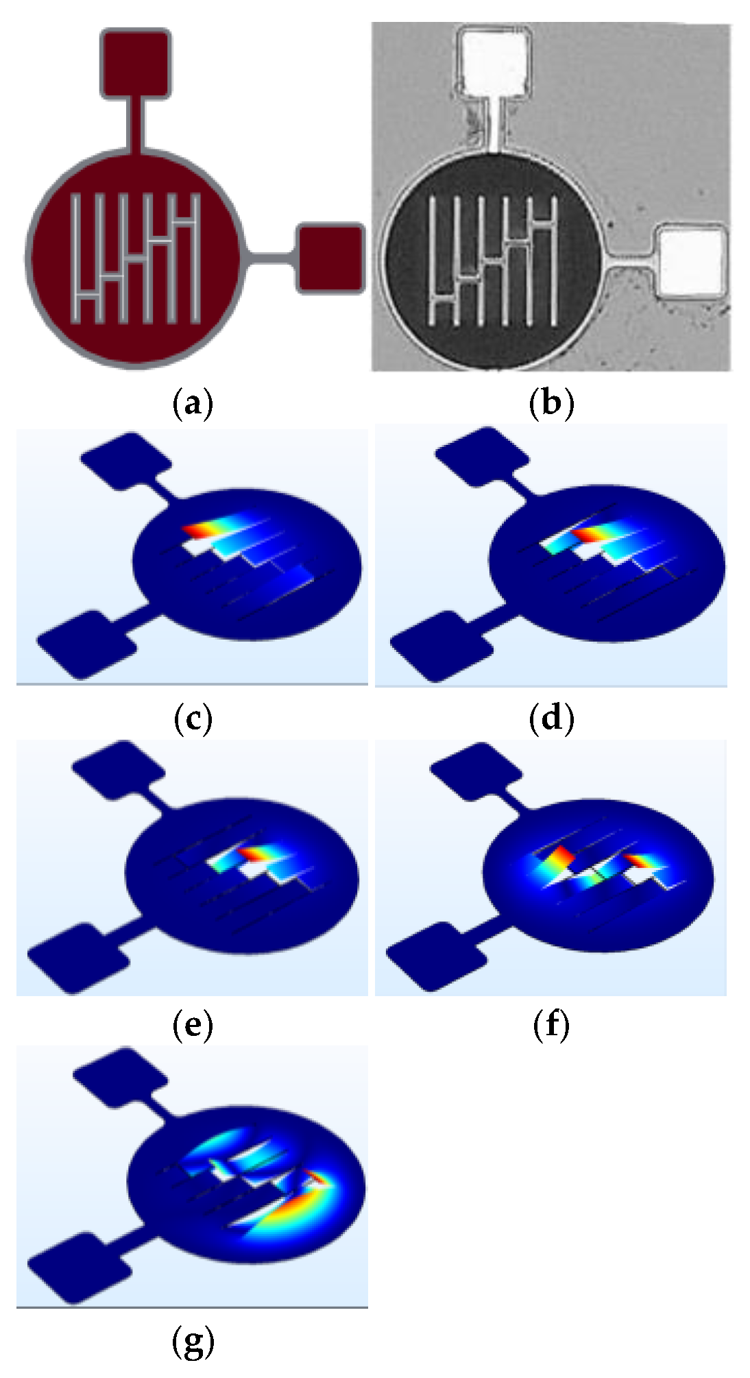 All geometries developed in this work were designed in strict accordance with the dimensional tolerances and design rules of the chosen MEMS fabrication process. These constraints directly influence operational performance, affecting sensitivity, resonance characteristics, and bandwidth.