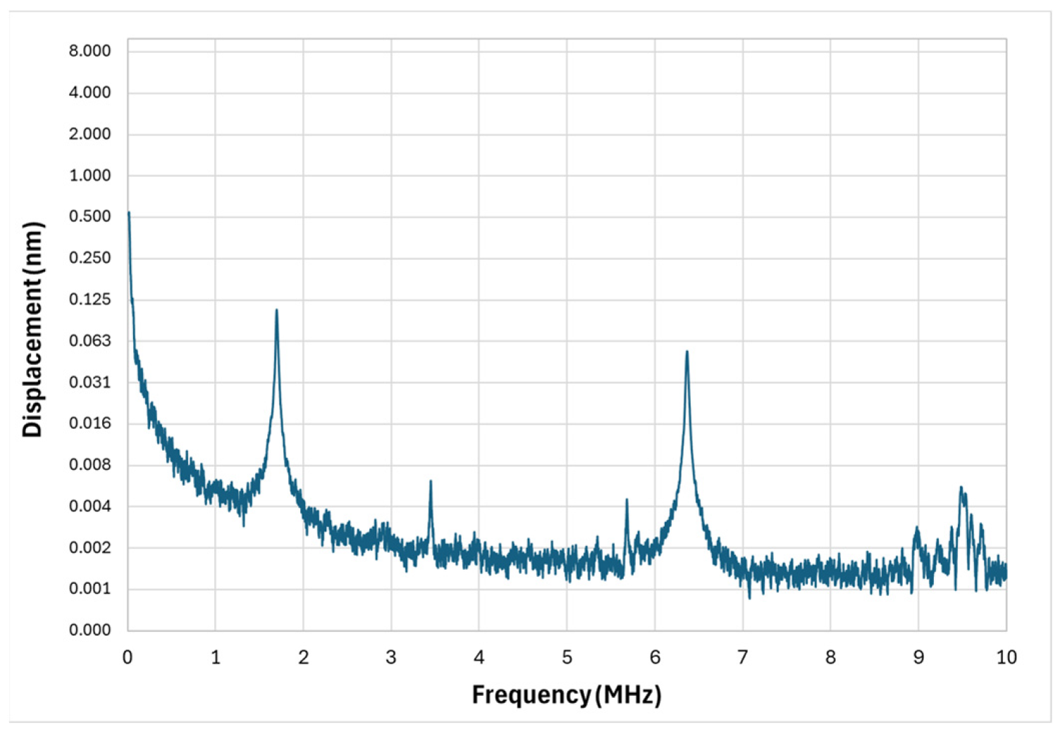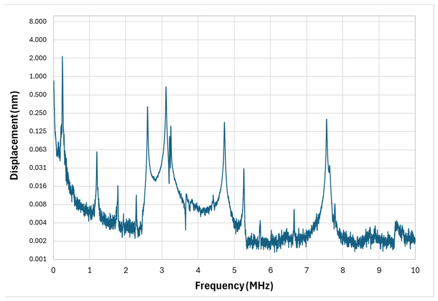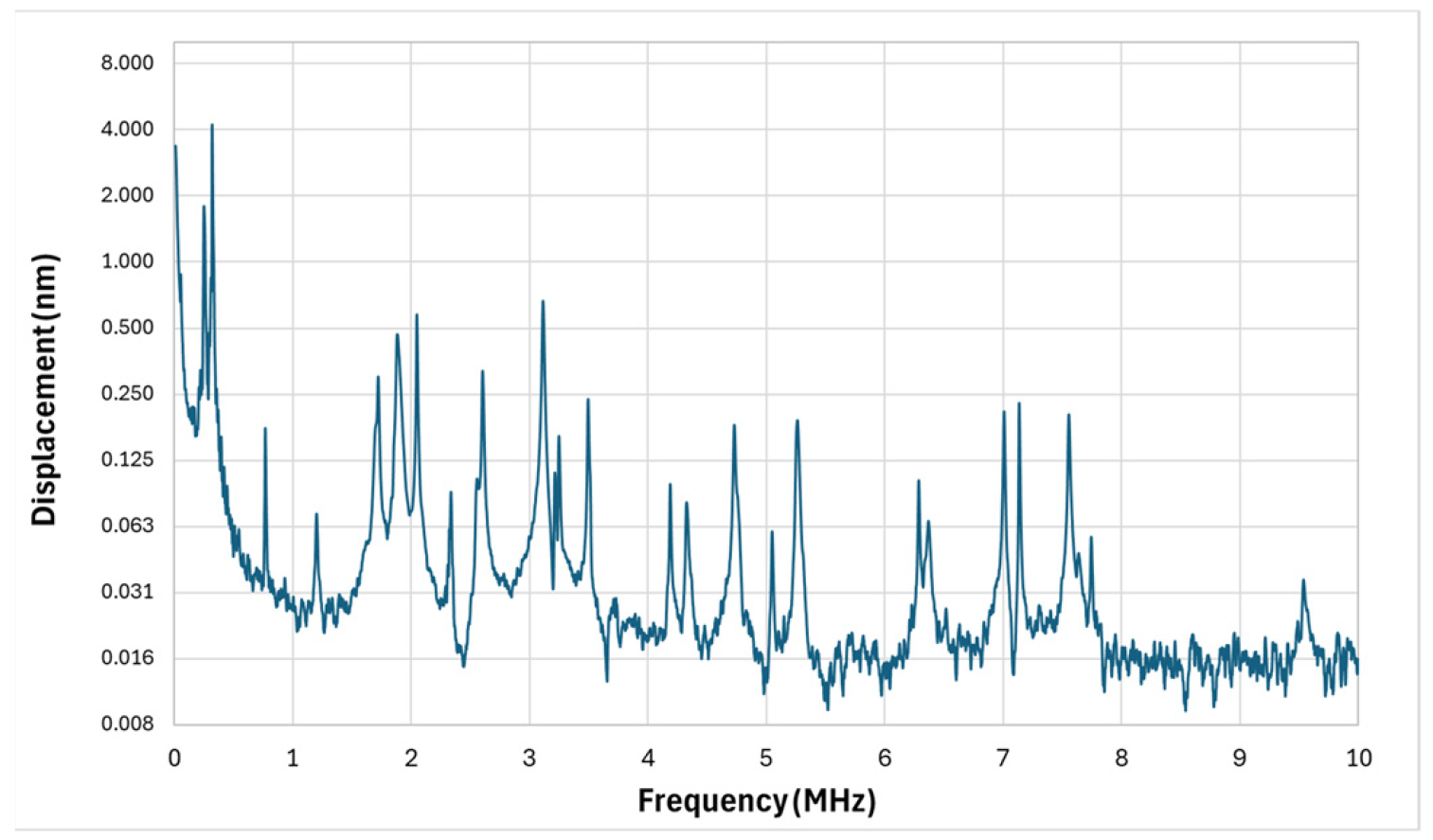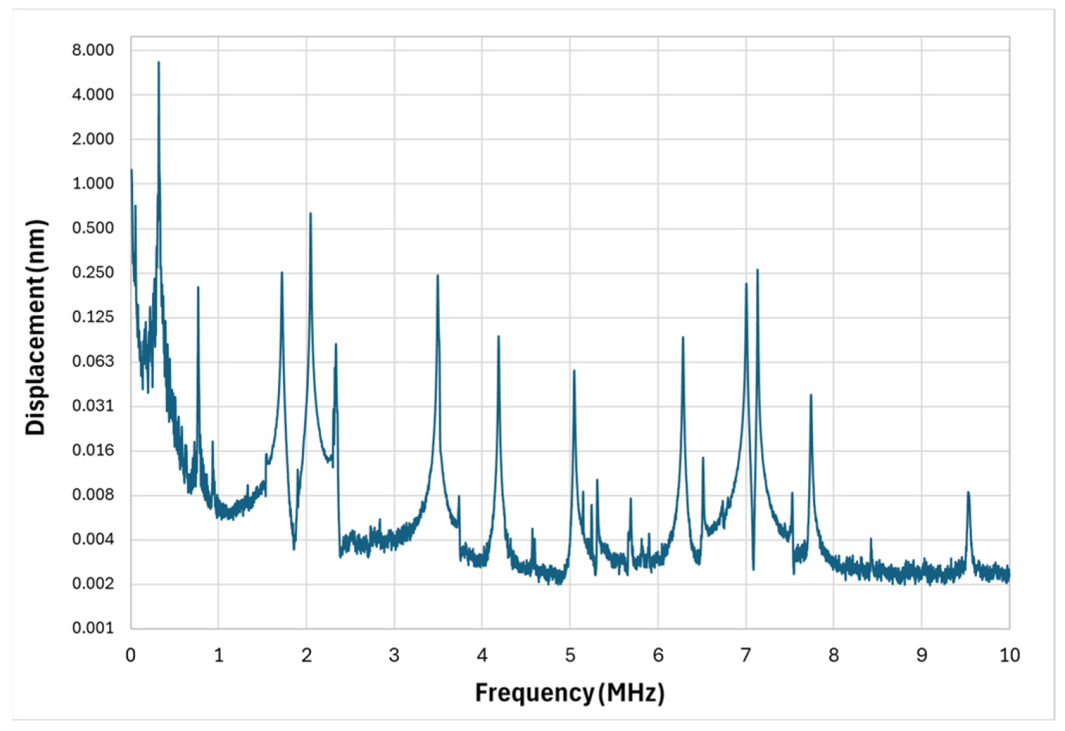 Figure 9. This design takes a different approach by using length variation to deliberately spread resonances across a wide spectrum. The longest cantilever exhibited a first-mode resonance at 1.8 MHz with a Q-factor of 204, producing strong displacement amplitude in the lower-megahertz range.