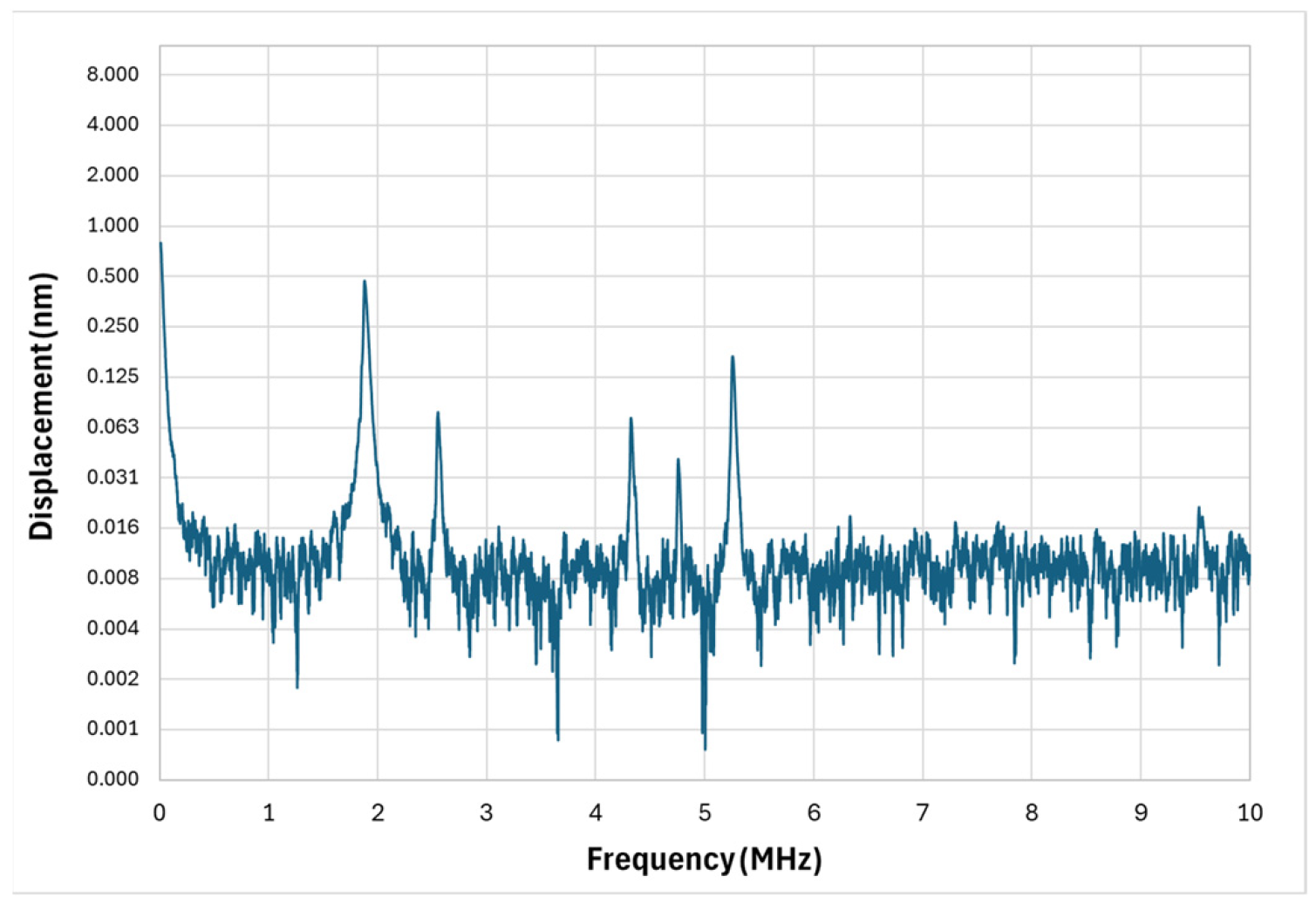 More promising, however, are the distributed resonance peaks at higher frequencies, specifically in the 1.5–2.5 MHz and 6.5–7.5 MHz bands. These frequency regions correspond to modes involving both central membrane motion and higher-order bending or torsional vibrations of the arms. In these ranges, displacement amplitudes were significantly higher than in surrounding spectral regions, suggesting that the floated cross can be tuned to emphasize modes relevant for PAI.