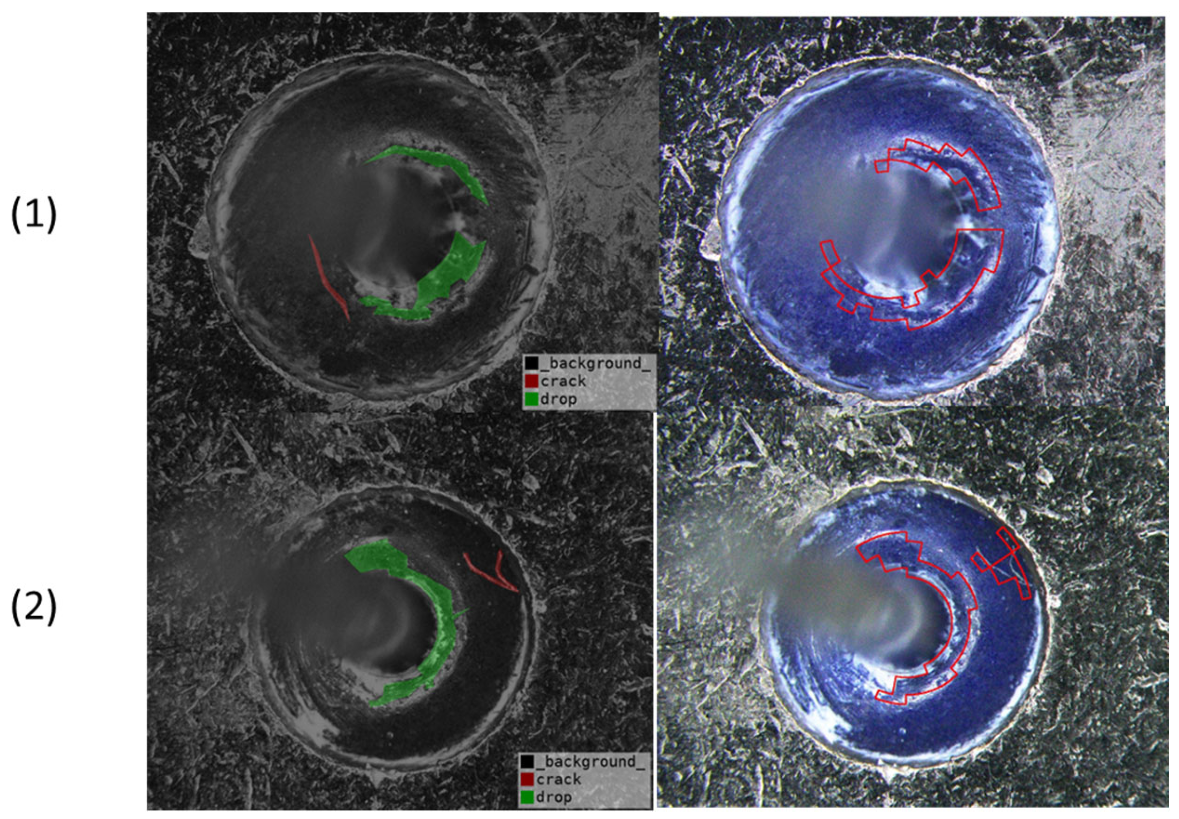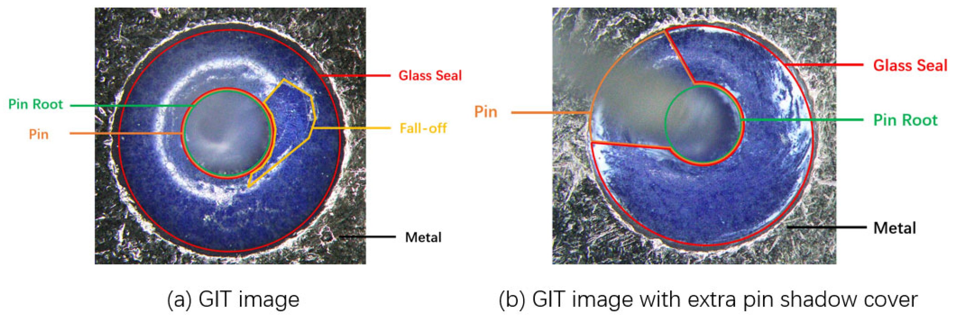Figure 2 illustrates two examples of GIT images acquired from two shooting angles, in which the ring-like glass is sealed between the metal shell and the pin. As illustrated in