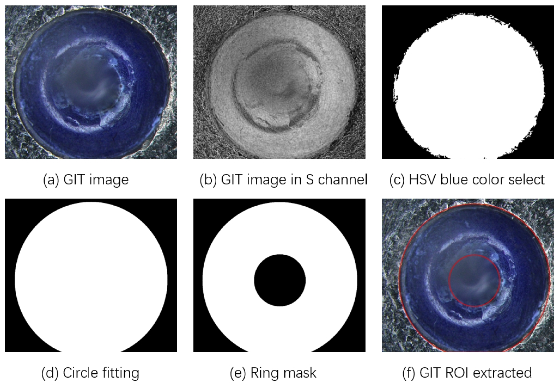 Figure 2, the acquired GIT image involves the regions of the pin, the sealing glass, and the peripheral metal. The pins located in the centers of the GITs demonstrate blurred and different shapes due to the shooting angle. The regions of the sealing glass demonstrate a blue-like characteristic due to the materials encapsulated in this kind of GIT. This blue-like characteristic is significant for extracting the circular-ring-like ROI from the GIT image. The ROI is possibly not an entire circular ring due to the shooting angle. As indicated in