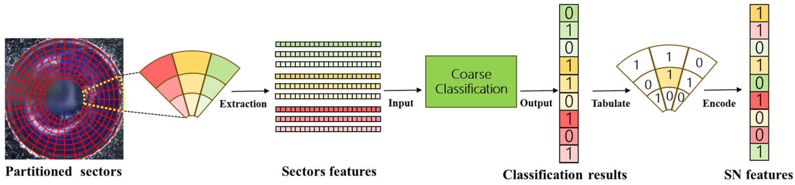 22], involving statistical color features, gray variations, reflective features, and statistical gradient directions. In the fine classification stage, a sector neighbor (SN) feature vector for each sector is designed based on the coarse classifications of its neighbor sectors, which can reveal its local neighbor characteristics. Finally, the four categories of sector features and the SN feature vector of the sector are input into the GBDT to distinguish whether the sector is defective.