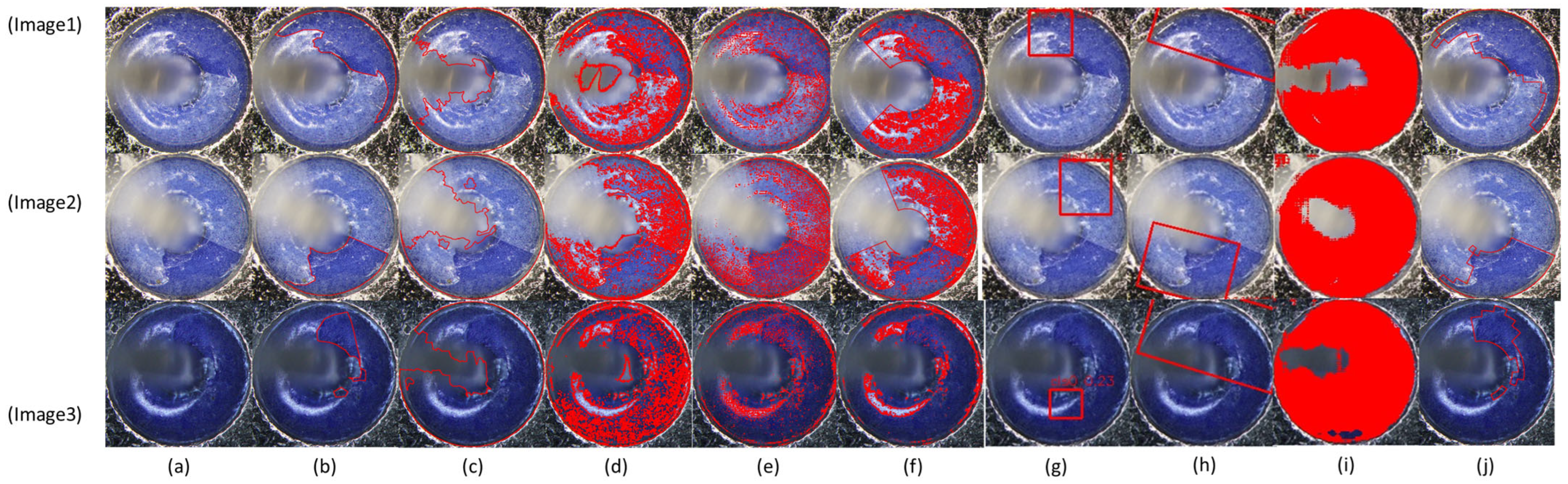 26] is also influenced by the reflection characteristics of the lights of the sealing glass, since it distinguishes the defects by separating the high-frequency and low-frequency components of the GIT image. Thus, it misidentifies a number of non-defective areas as defective and achieves a poor inspection performance with 83.92% PMA.