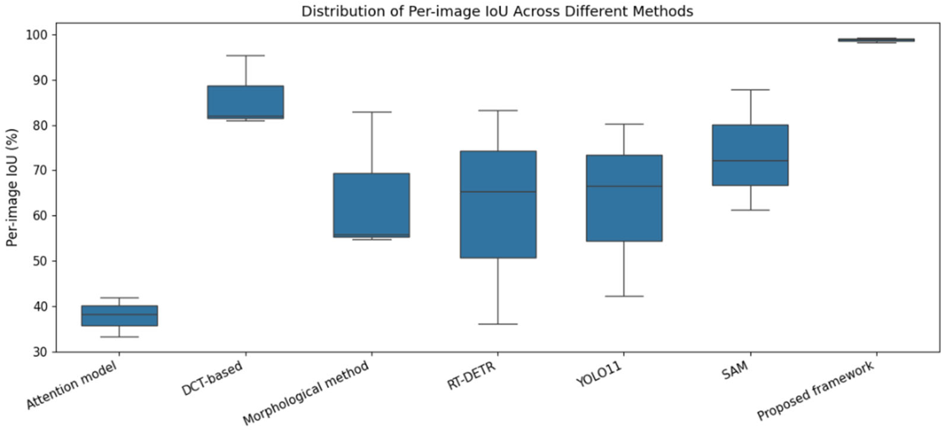 Figure 7, four traditional inspection methods wrongly inspect many regions as fall-off regions. RT-DETR and YOLO11 bound the inspection results due to their bounding-box characteristics. Thus, they either over-inspect or miss-inspect the fall-offs. SAM semantically segments the potential defects from the GIT image, which also wrongly inspects many regions as fall-off regions. Comparatively, our method almost inspects all the fall-offs. More importantly, the distribution of per-image IoU values in