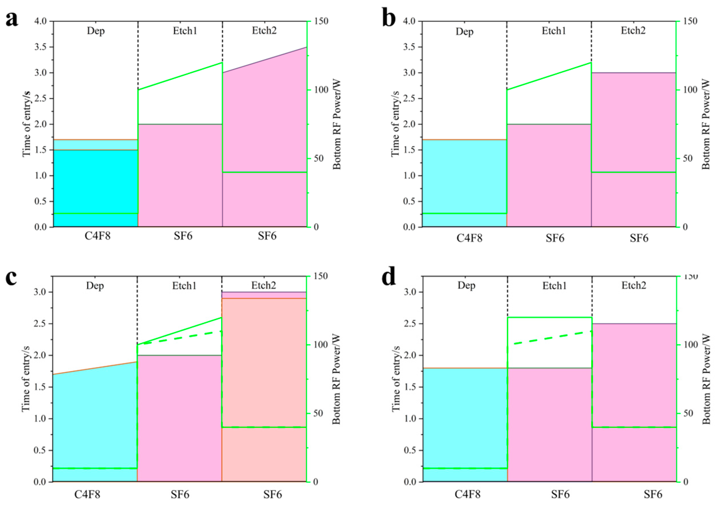| Parameters | Cycles | Time/s | Center C4F8/sccm | Edge C4F8/sccm | Center SF6/sccm | Edge SF6/sccm | LFPower/W |