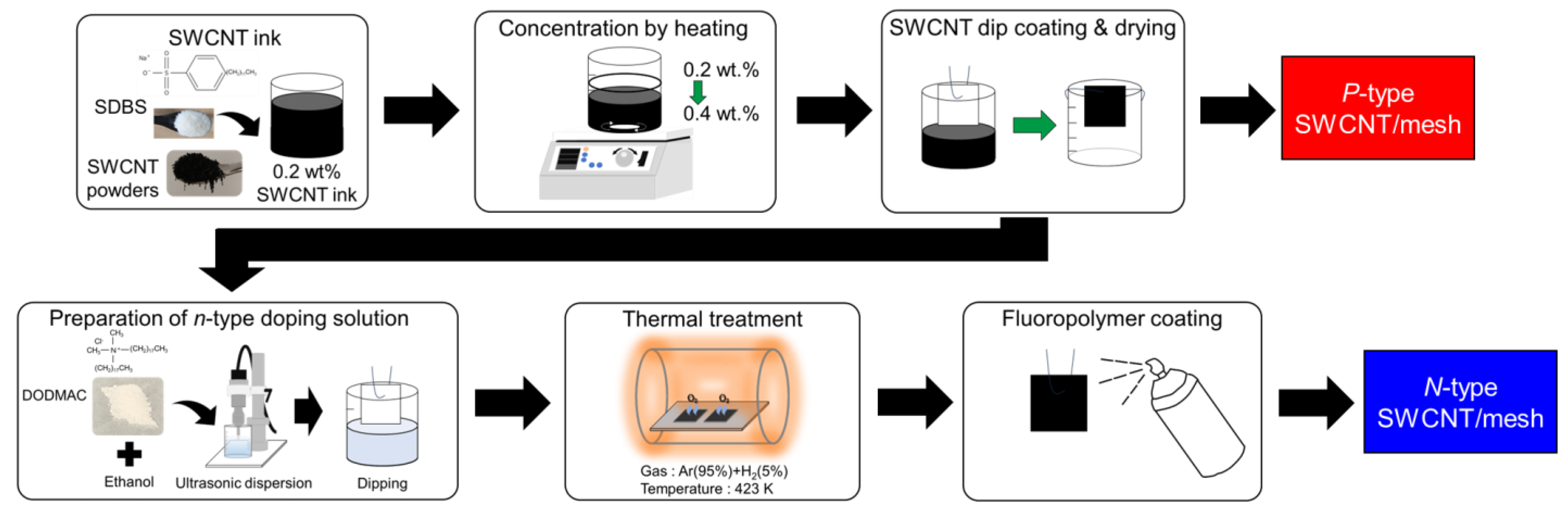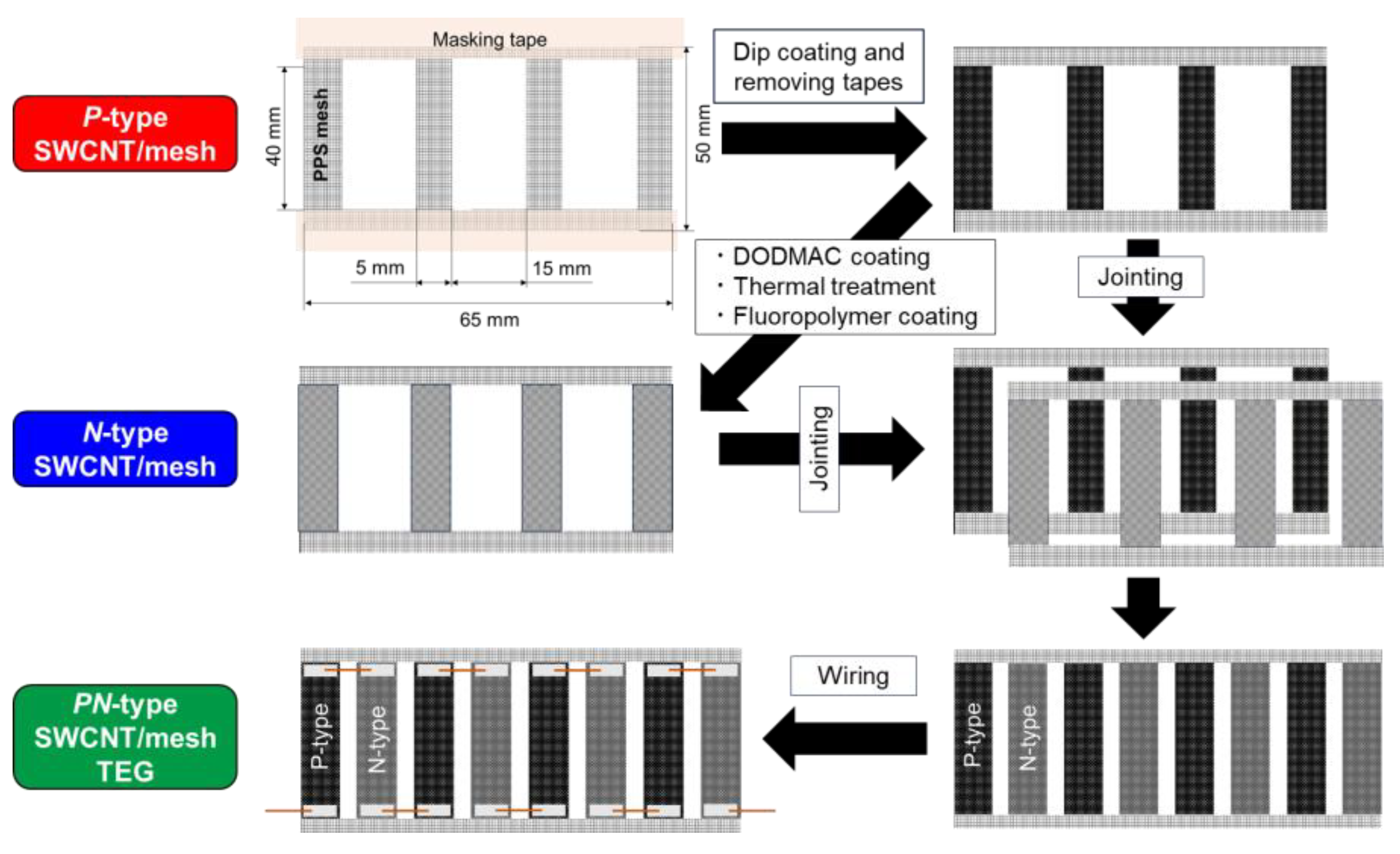 - Amezawa, T.; Takashiri, M. Stable n-type single-walled carbon nanotube/mesh sheets by cationic surfactant doping and fluoropolymer coating for flexible thermoelectric generators. Coatings 2024, 14, 794. [Google Scholar] [CrossRef]