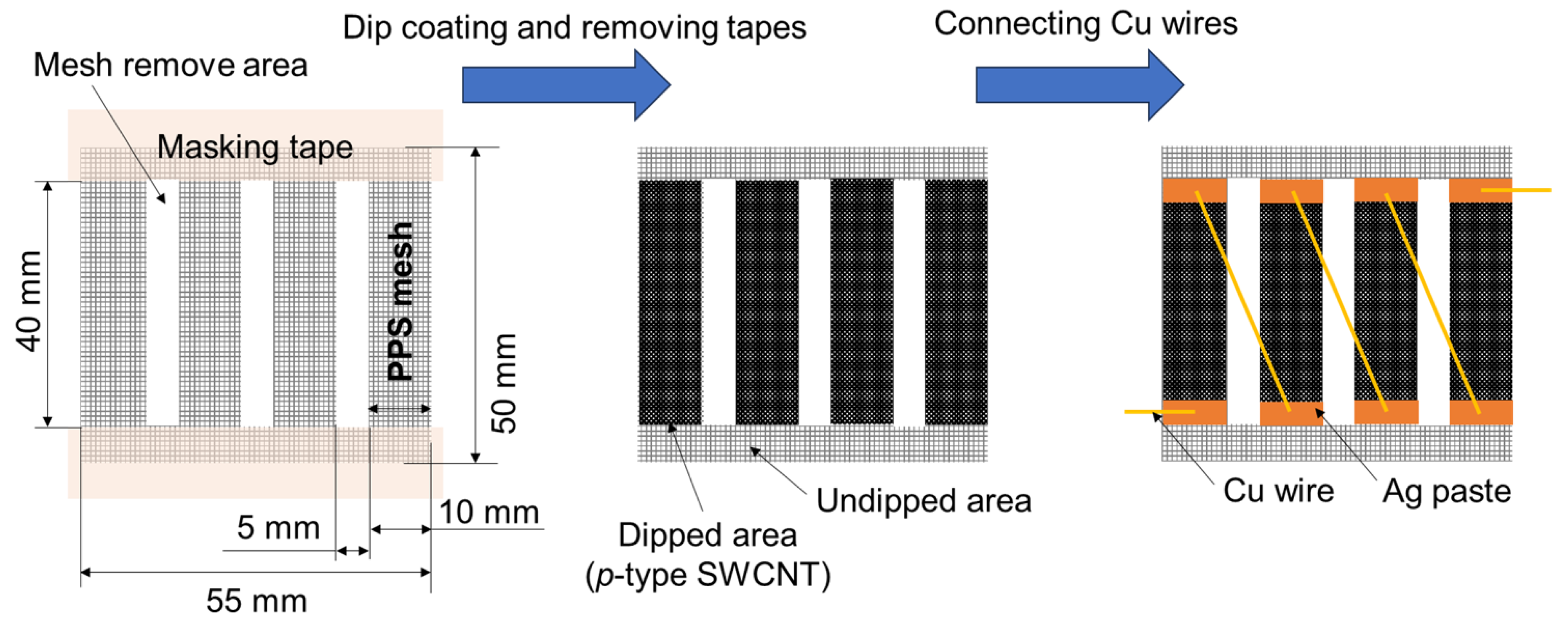 - Miura, K.; Amezawa, T.; Tanaka, S.; Takashiri, M. Improved heat dissipation of dip-coated single-walled carbon nanotube/mesh sheets with high flexibility and free-standing strength for thermoelectric generators. Coatings 2024, 14, 126. [Google Scholar] [CrossRef]